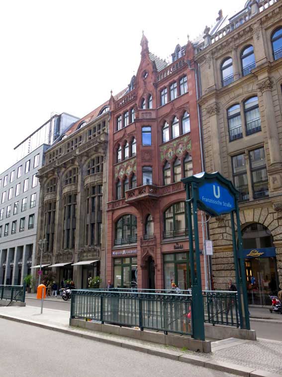 2014 - Berlin - Friederichstr. 169 Gebäude dbb Forum (neues Gebäude links) , 168/167, rot mit Erker 166, Gebäude 165 (rechts)